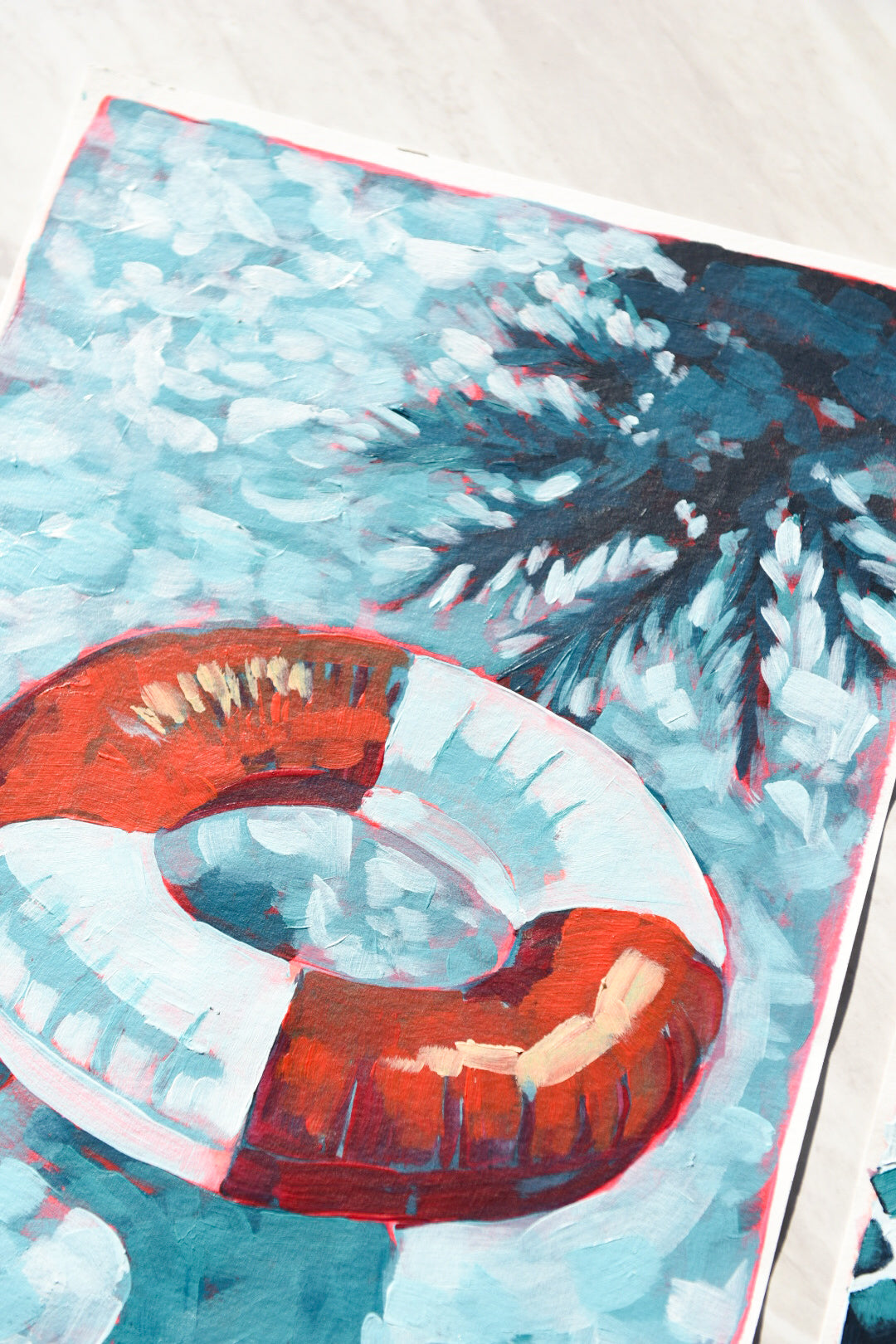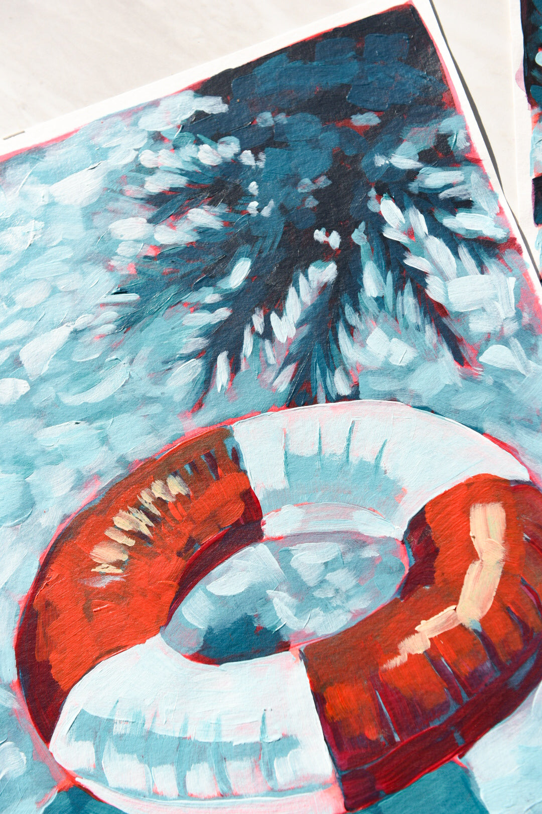 While painting this pool ring, I couldn’t help but feel a metaphor building with each stroke. This process, this medium, this rediscovery: it has been a life raft. A way of pulling me back up from the depths as I’ve wrestled with who I am in this creative world. I so love art for her way of catching you when you drift. For the way she reminds us of buoyancy and belonging. With the bright pool ring and the shimmering waters, it feels like a reminder that I am still held, still floating, still finding my way.